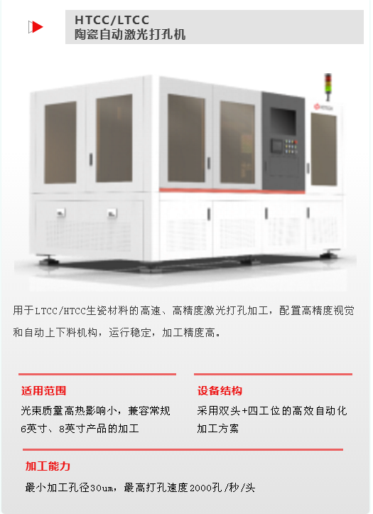陶瓷載板已成為大功率電力電子電路結構技術和互連技術的基礎材料,廣泛用于高端電路板市場。華工激光圍繞陶瓷片、陶瓷基板的da孔、切割、檢測等工藝流程開發(fā)系列解決方案。