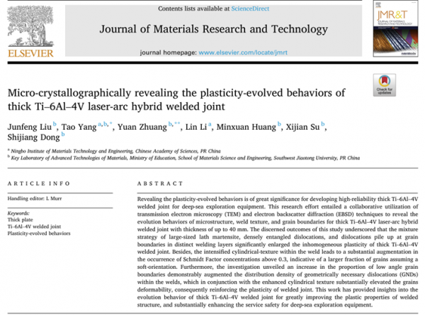 第一篇:Micro-crystallographically revealing the plasticity-evolved behaviors of thick Ti–6Al–4V laser-arc hybrid welded joint   https://doi.org/10.1016/j.jmrt.2023.12.007