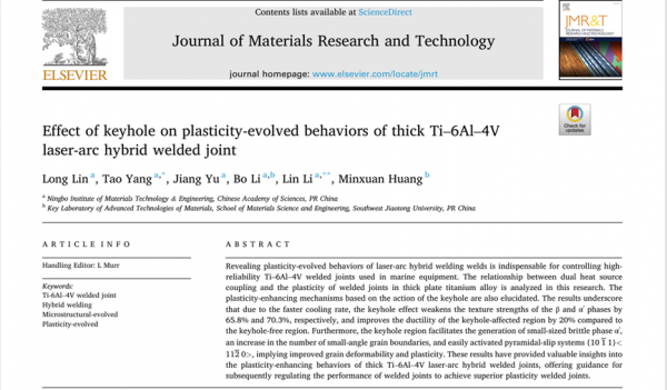 中國(guó)科學(xué)院寧波材料所激光極端制造研究中心李琳研究員和楊濤研究員團(tuán)隊(duì)在《Journal of Materials Research and Technology》期刊針對(duì)鈦合金厚板焊接連載三篇論文,分別...