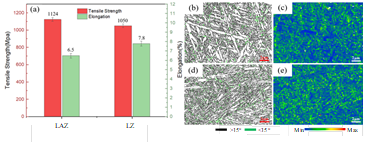 不同焊接區(qū)域的拉伸性能和微觀晶體學(xué)特性:(a) 拉伸性能;(b-c) 激光電弧區(qū)晶體學(xué)特征;(d-e) 激光區(qū)晶體學(xué)特征。