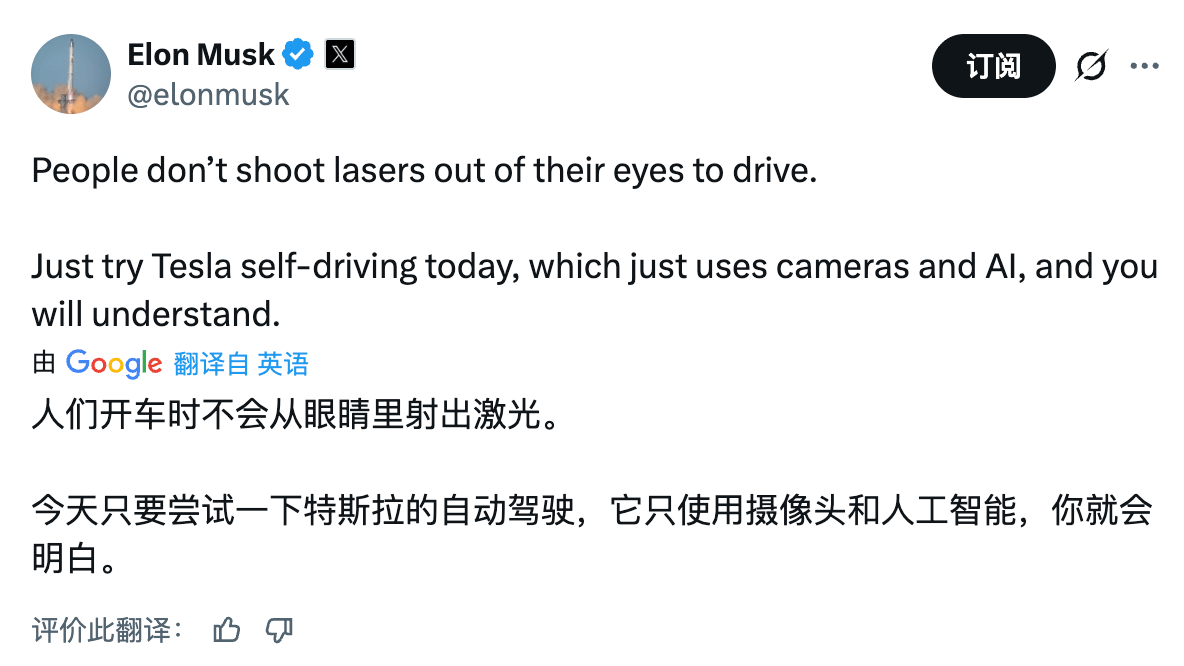 今年早些時(shí)候,馬斯克再次重申了他根深蒂固的質(zhì)疑立場(chǎng)。“人類駕駛時(shí)又不需要從眼睛里發(fā)射激光,”馬斯克今年3月在X上發(fā)文時(shí),并附上了他在2019年發(fā)表的相關(guān)言論的視頻鏈接,“只要體驗(yàn)過(guò)特斯拉僅靠攝像頭和AI實(shí)現(xiàn)的自動(dòng)駕駛,你就會(huì)明白?!?/p>