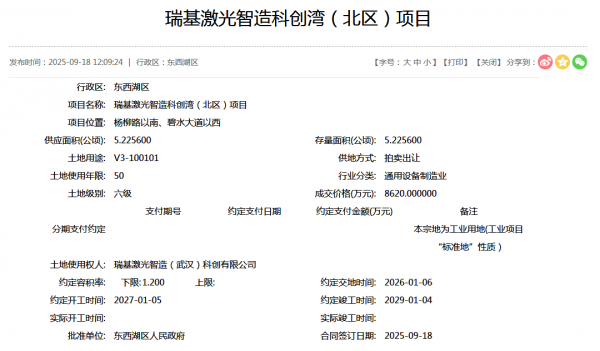 武漢作為“中國光谷”所在地,始終是激光產業(yè)的戰(zhàn)略高地。2025年9月,瑞基激光智造(武漢)科創(chuàng)有限公司以8620萬元拿下東西湖區(qū)5.2256公頃土地,啟動總投資17億元的科創(chuàng)灣(北區(qū))項目,計劃2027年開工、2029年竣工,打造激光產業(yè)創(chuàng)新生態(tài)綜合體。