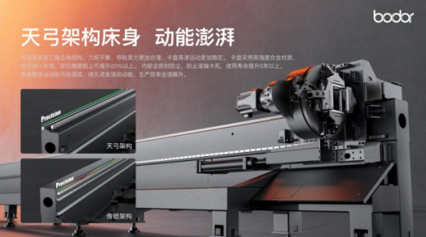 首先,創(chuàng)新的天弓架構(gòu)床身采用三角立體傳動系統(tǒng),從力學上優(yōu)化高速運動中導軌受力,達到力矩平衡,為所有精密動作提供持久而可靠的基礎(chǔ),真正像天弓滿弦,持久迸發(fā)強勁動能,生產(chǎn)效率全速飆升。
