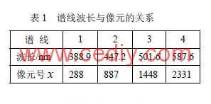 首先對(duì)譜線在 CCD上的對(duì)應(yīng)像元位置進(jìn)行標(biāo)定。實(shí)驗(yàn)中選擇氦燈的 4條特征譜線分別為 388.9nm、447.2nm、501.6nm、587.6nm,先采集數(shù)據(jù)得到各譜線峰值在 CCD上對(duì)應(yīng)的像元位置如表 1所示。