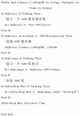 OPC數(shù)據(jù)訪問方法主要有同步訪問、異步訪問和訂閱方式數(shù)據(jù)采集。對于異步訪問,OPC服務(wù)器接到OPC應(yīng)用程序要求后,幾乎立即將方法還回,OPC應(yīng)用程序不必處于等待狀態(tài),可以處理其他任務(wù)。當(dāng)OPC服務(wù)器完成數(shù)據(jù)訪問時,觸發(fā)OPC應(yīng)用程序的異步訪問完成事件,OPC應(yīng)用程序在的VB 事件處理程序中接受從OPC服務(wù)器傳輸過來的數(shù)據(jù);對于訂閱方式數(shù)據(jù)采集,OPC服務(wù)器也是通過觸發(fā)事件方式傳輸數(shù)據(jù)到OPC應(yīng)用程序。