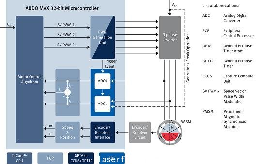 英飛凌AUDO MAX系列非常適用于電機的控制。TriCore架構(gòu)和MC-ISAR eMotor驅(qū)動程序可采用高級控制策略控制多臺三相電機,包括無刷直流電機(BLDC)塊交換(block commutation,BC)及永磁同步電機(PMSM)磁場定向控制(FOC)。