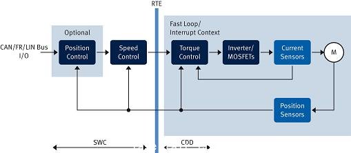 硬件相關(guān)的模塊,包括重復(fù)使用的AUTOSAR MCAL驅(qū)動(ADC、SPI、DIO),或PWM信號生成(EmoPwm驅(qū)動CCU6)和編碼器接口EmoIcu(通過GPT12讀取編碼信號)的專用模塊。客戶編寫的位置和轉(zhuǎn)速控制代碼,可以按標(biāo)準(zhǔn)軟件成分(SW-C)添加,就像AUTOSAR所提供的一樣。