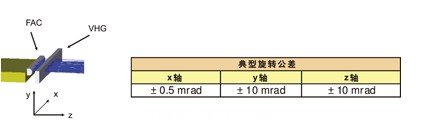 圖1所示的是采用外部波長穩(wěn)定方案的半導體激光器bar條的典型組成。VHG的角度敏感性有利于減少半導體激光器bar條的發(fā)散,特別是在快軸方向上利用快軸準直#p#分頁標題#e#透鏡(FAC)來準直光束。VHG將顯著提高光學反饋。VHG直接置于FAC之后。圖1中的表格所示的是有效波長穩(wěn)定所需的典型對準公差。
