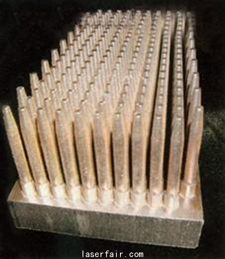 圖2 冷卻柱:通過直接金屬激光燒結僅在30小時內生成有著200個冷卻柱和內部冷流道的這種零件。在注塑過程中,冷卻柱用來更好進行冷卻和縮短生產(chǎn)循環(huán)時間。節(jié)省了50%的生產(chǎn)費用