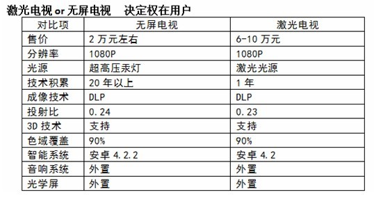 對于用戶來講,無論是無屏電視還是激光電視,關(guān)注的核心在于效果、價(jià)格和售后。無屏電視、激光電視對消費(fèi)者的大畫面、高清晰、護(hù)眼、智能等功能需求基本一致;但價(jià)格相差巨大,影響產(chǎn)品進(jìn)入普通大眾家庭;無屏電視采用超高壓汞燈光源,用戶獨(dú)享終身免費(fèi)換燈的優(yōu)惠,而激光電視宣傳支持25000小時,對于新技術(shù)的進(jìn)入或許很難打動獵奇的用戶。