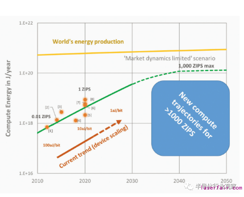 不斷增長的全球計(jì)算能量是由不斷增長的計(jì)算需求驅(qū)動的(圖8b),盡管如此,計(jì)算處理器單元(例如CPU、GPU、FPGA)中每一位轉(zhuǎn)換的芯片級能量在過去40年中一直在減少(如摩爾定律所示),當(dāng)前處理器中為10 aJ或10-17 J。 然而,對計(jì)算增長的需求正在超過摩爾定律的發(fā)展。摩爾定律目前正在放緩,因?yàn)槠骷?guī)模正在接近基本物理極限。如果計(jì)算能量的指數(shù)增長不受限制,市場動態(tài)將限制計(jì)算能力的增長,這將導(dǎo)致能源曲線變平(圖8a中的“市場動態(tài)限制”場景)。因此,需要在計(jì)算的能源效率的根本改進(jìn),以避免“限制”的情況。 基本的難題是計(jì)算中的比特利用率,即實(shí)現(xiàn)一個計(jì)算指令所需的單位比特轉(zhuǎn)換數(shù)。