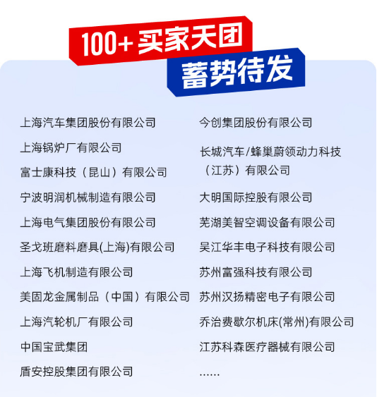 本屆展會將全面展示應(yīng)用于石油化工、航空航天、電子3C、有色金屬、環(huán)保設(shè)備、紡織機械、食品機械、通用機械、儀器儀表、工量刃具、模具制造、家具制品、汽摩配件、電動工具、金屬冶煉、物流運輸、機械制造、生物科技、新能源新材料、農(nóng)業(yè)機械、機床工具、家用電器、汽車制造、醫(yī)療器械等24大行業(yè)的新產(chǎn)品、新技術(shù)及新解決方案,100+買家天團(tuán)已整裝待發(fā),將組團(tuán)赴會!