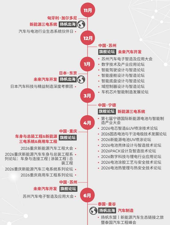 2026年,我們將推出多種活動形式,覆蓋旗艦論壇、閉門峰會、主題系列會議、Workshop科技工坊、Techshow高新科技發(fā)布、圓桌對話、科技導(dǎo)覽、揚(yáng)帆出海、先鋒獎項、走進(jìn)智造、商務(wù)酒會等全維度活動,為您呈現(xiàn)一場多元化的創(chuàng)新生態(tài)體驗。從聚焦沖焊涂總工藝的新能源工程大會、探索前瞻開發(fā)與測試技術(shù)的專業(yè)論壇,到深度研討前沿科技的TechShow & Workshop;從沉浸式國內(nèi)外智造產(chǎn)線工廠考察,到促進(jìn)深度鏈接的圓桌會議、交流晚宴與精準(zhǔn)配對,通過旗艦峰會、主題會議、Workshop科技工坊、出海及商務(wù)考察等全維度活動打造集技術(shù)洞察、知識共享與商業(yè)合作為一體的高端平臺。